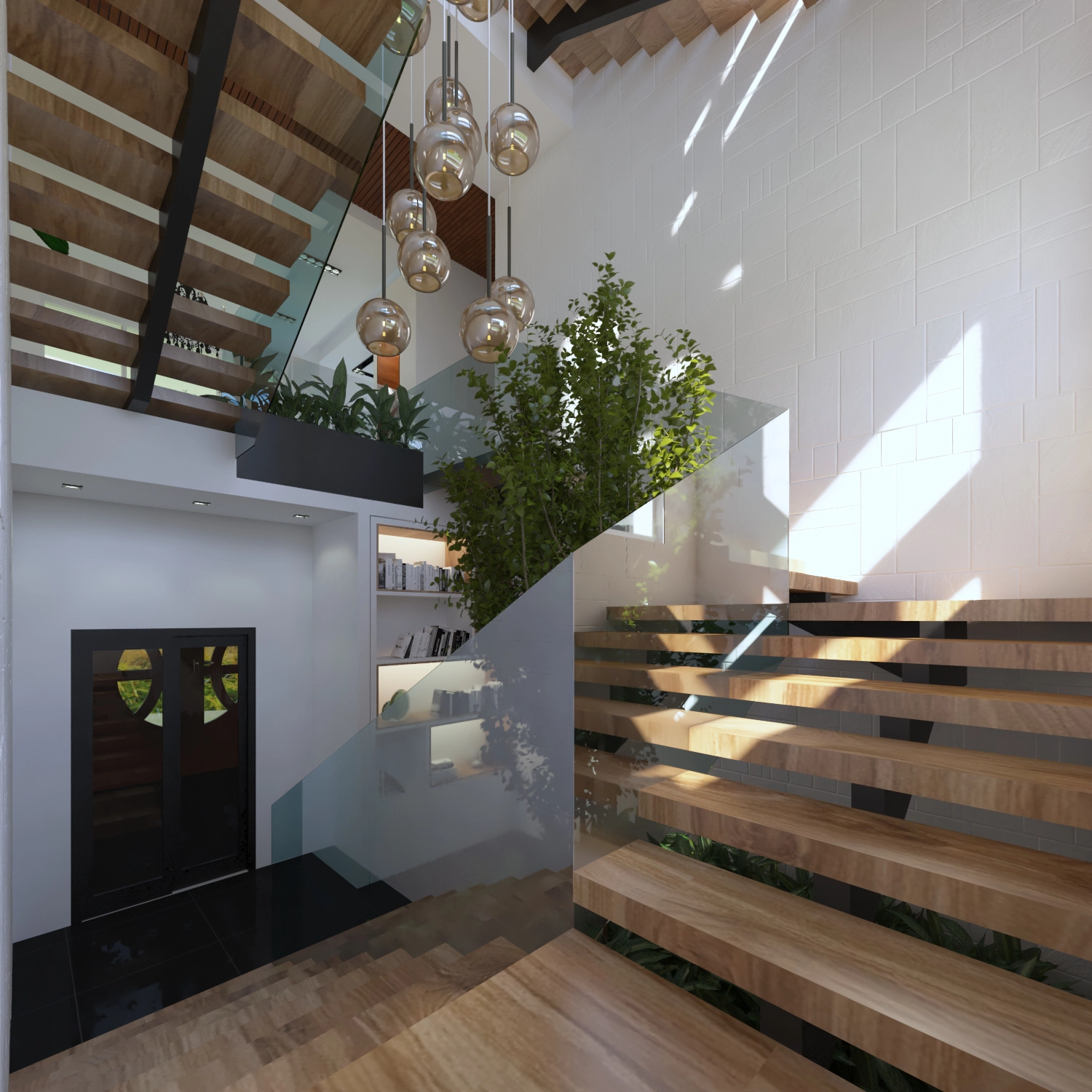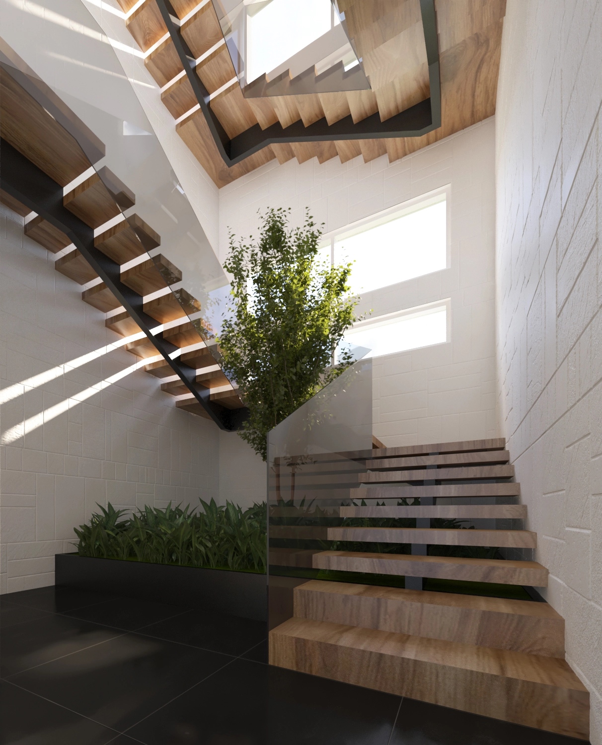 Vertical access, powerful and like a hinge, connects the spaces on the floors of this villa to each other.